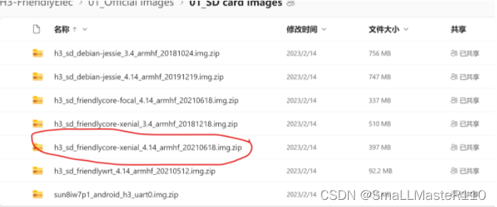 在这里(https://download.friendlyelec.com/nanopineocore) 下载你的镜像文件。本人选的OneDrive,有会员的小伙伴可以选择网盘下载。根据你的板子的型号以及你的需求,选择你的镜像。这里我选择的是:Base on UbuntuCore, kernel: Linux-4.14