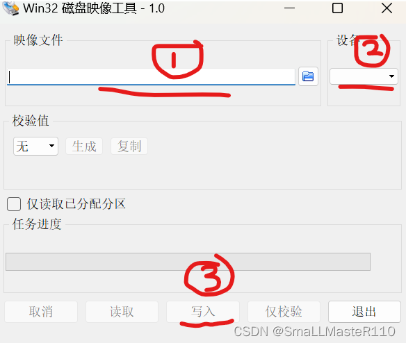 - 使用管理员权限打开win32diskimager,选择你的镜像和刚才的sd卡,写入即可